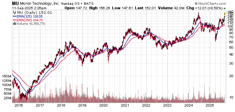 09/11/’25 — Today, in selected accounts, I purchased Micron Technology (mu) at $152.3269. For more information on Micron, please click here.